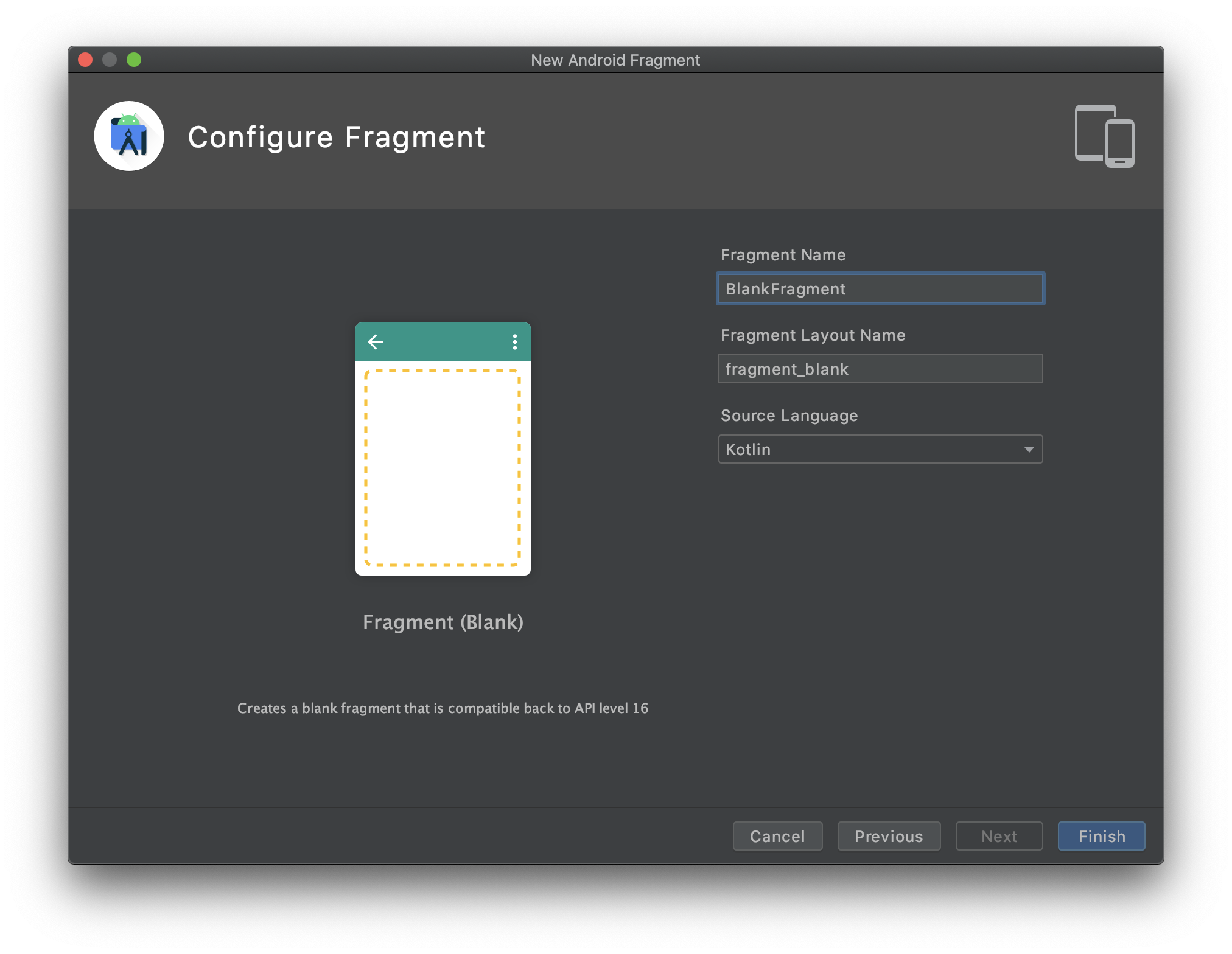 Fragment 를 생성하시면 아래와 같이 생성되는 것을 보실 수 있습니다.
