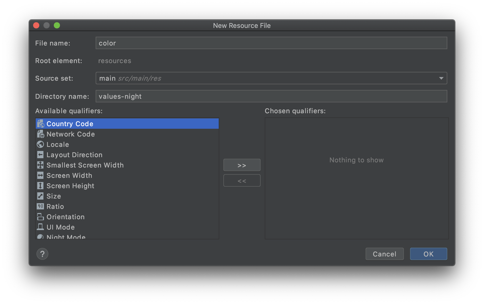 ์ด๋ Directory name์ values-night๋ก , File name์ color๋ก ์ค์ ํด์ฃผ์ธ์!