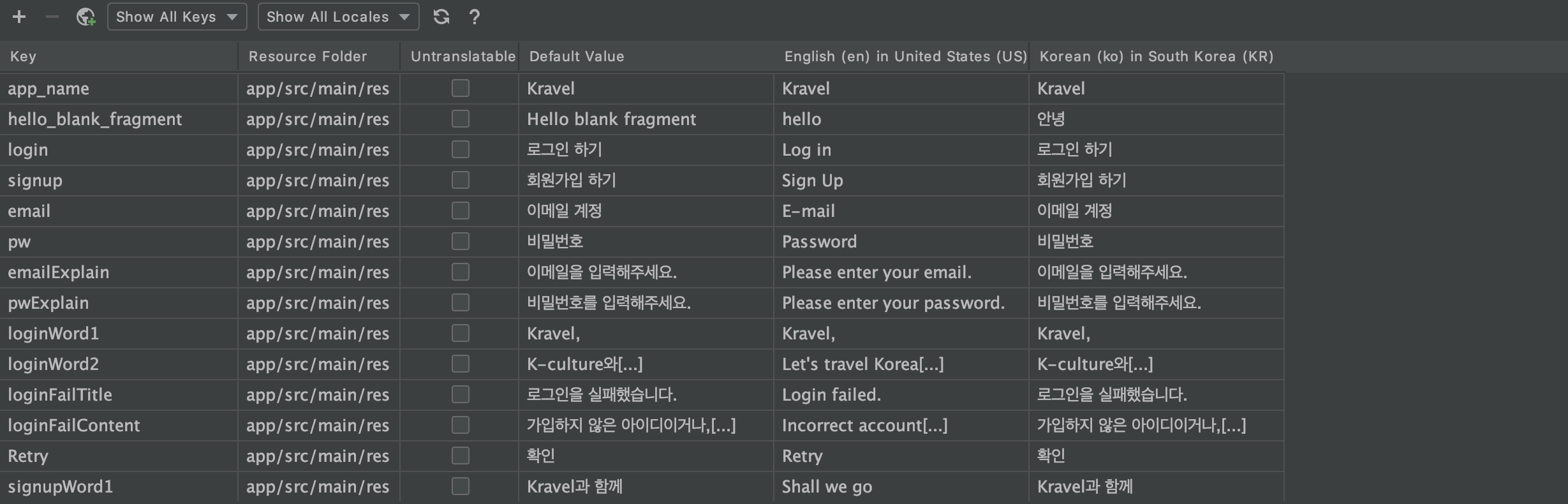 κΈ°λ³Έμ€μ string / Kor μΌλ string / English μΌλ string μ΄ 3κ°μ string κ°μ΄ νμνκΈ° λλ¬Έμ νλνλ <string name = ""> </string> μ λ§λ€μ΄μ£Όμλ κ²λ³΄λ€λ μλ¨μ μκΈ°λ Open editorμ μ΄μ©νμλκ² μ’μ΅λλ€ : )