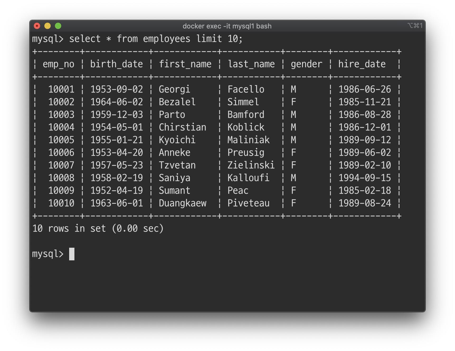 ์ด์ MySQL ์ปจํ ์ด๋๋ฅผ ์คํํด๋ณผ ์ฐจ๋ก ์ธ๋ฐ์. ์๊น ๋ง๋ค์ด์ฃผ์๋ mysql1์ ์คํํ๋ ค๋ฉด docker exec -it ๋ช ๋ น์ด๋ฅผ ํตํด