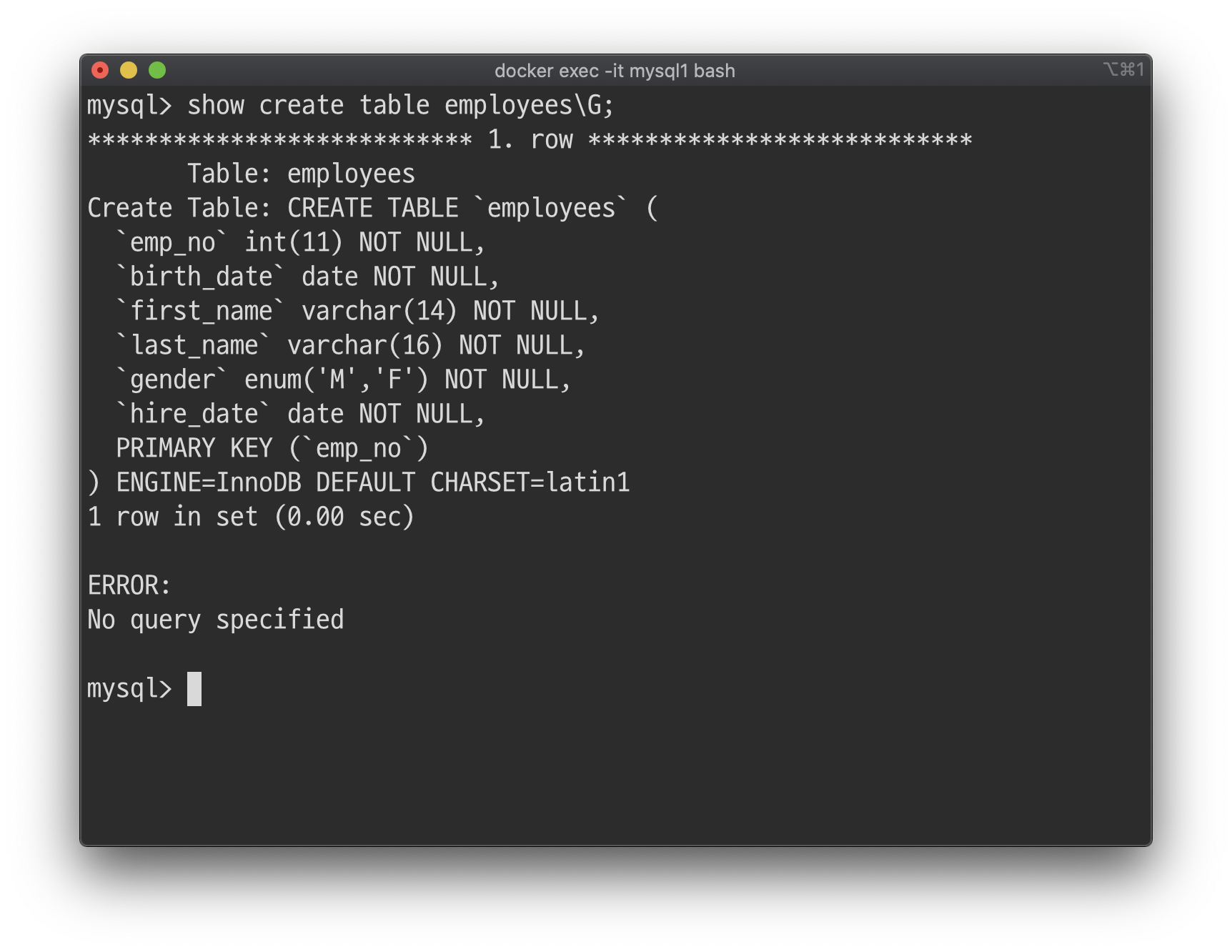 table์ create ์ฟผ๋ฆฌ๋ฅผ ํ์ธํ๋ ๊ฒฝ์ฐ, \G ์ต์ ์ ์ด์ฉํ๋ฉด ๊ฒฐ๊ณผ๊ฐ์ ํจ์ฌ ๋ณด๊ธฐ ํธํ๊ฒ ์ถ๋ ฅํ์ค ์ ์์ต๋๋ค.
