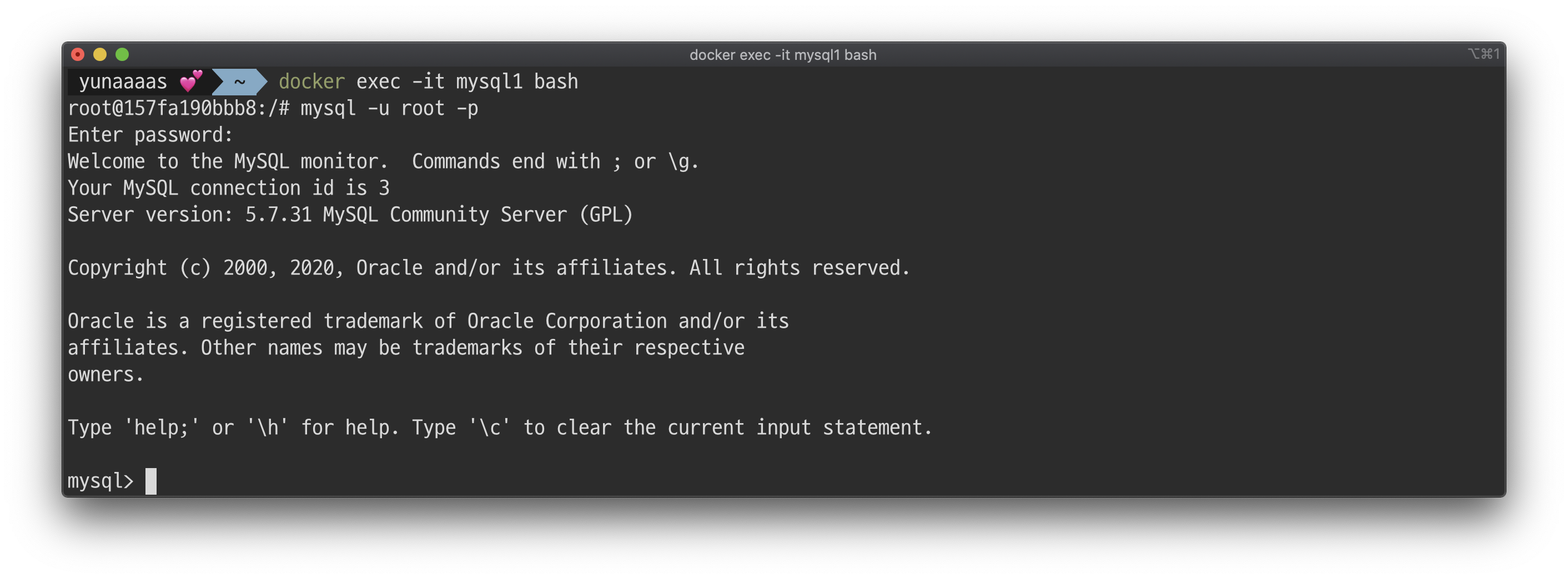 ์ด์ MySQL ์ปจํ ์ด๋๋ฅผ ์คํํด๋ณผ ์ฐจ๋ก ์ธ๋ฐ์. ์๊น ๋ง๋ค์ด์ฃผ์๋ mysql1์ ์คํํ๋ ค๋ฉด docker exec -it ๋ช ๋ น์ด๋ฅผ ํตํด