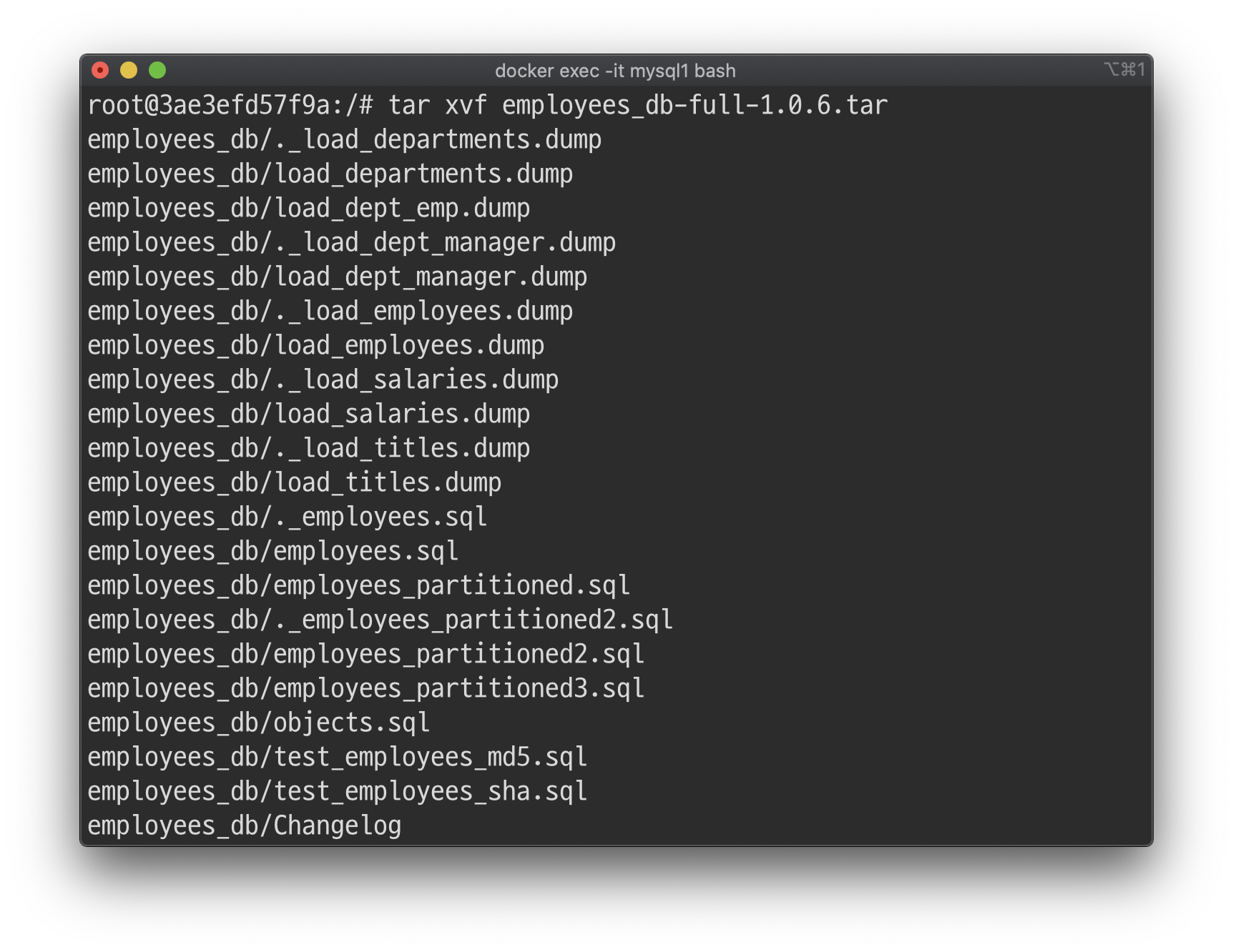 ๋ง์ง๋ง์ผ๋ก tar ๋ช ๋ น์ด๋ก employees_db-full-1.0.6.tar์ ์์ถ์ ํ์ด์ค๋๋ค.