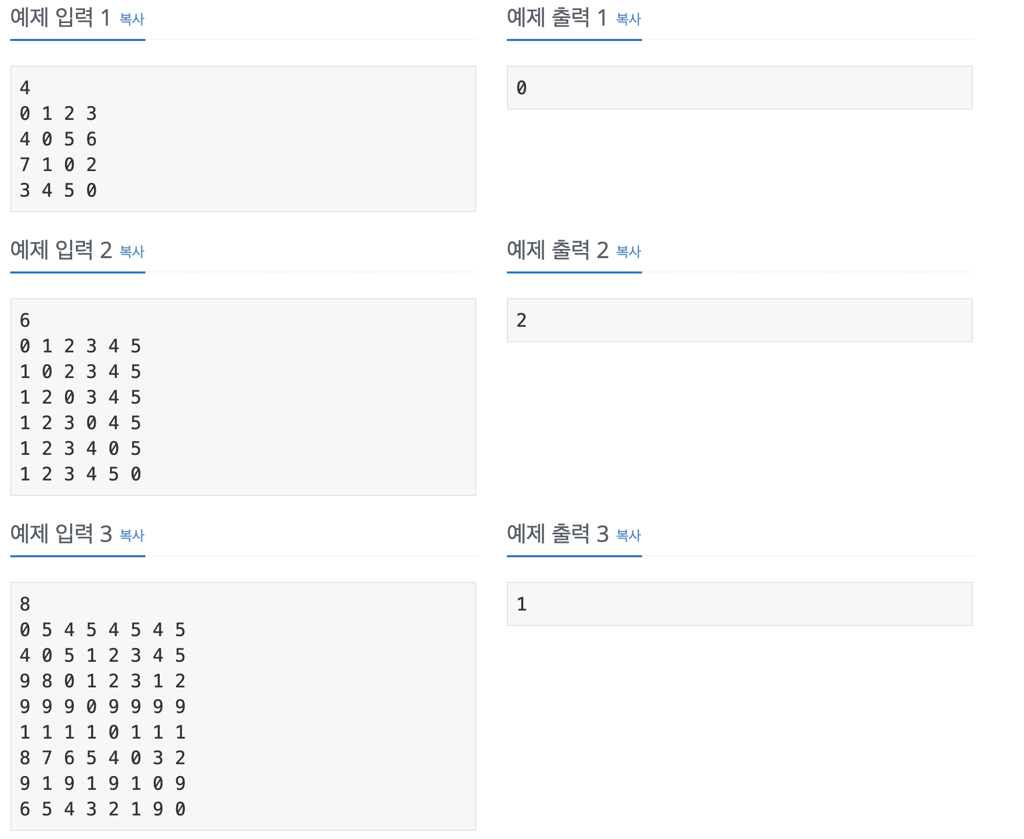 ์ฒซ์งธ ์ค์ N(4 ≤ N ≤ 20, N์ ์ง์)์ด ์ฃผ์ด์ง๋ค. ๋์งธ ์ค๋ถํฐ N๊ฐ์ ์ค์ S๊ฐ ์ฃผ์ด์ง๋ค. ๊ฐ ์ค์ N๊ฐ์ ์๋ก ์ด๋ฃจ์ด์ ธ ์๊ณ , i๋ฒ ์ค์ j๋ฒ์งธ ์๋ Sij ์ด๋ค. Sii๋ ํญ์ 0์ด๊ณ , ๋๋จธ์ง Sij๋ 1๋ณด๋ค ํฌ๊ฑฐ๋ ๊ฐ๊ณ , 100๋ณด๋ค ์๊ฑฐ๋ ๊ฐ์ ์ ์์ด๋ค.