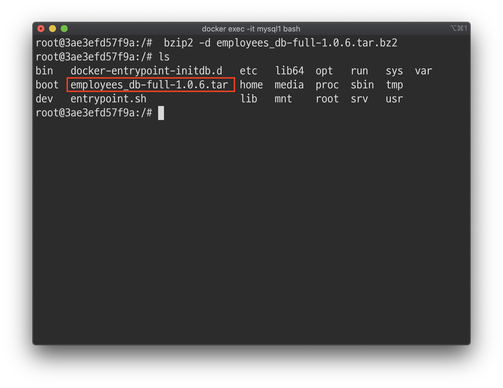 ๋ง์ง๋ง์ผ๋ก tar ๋ช ๋ น์ด๋ก employees_db-full-1.0.6.tar์ ์์ถ์ ํ์ด์ค๋๋ค.