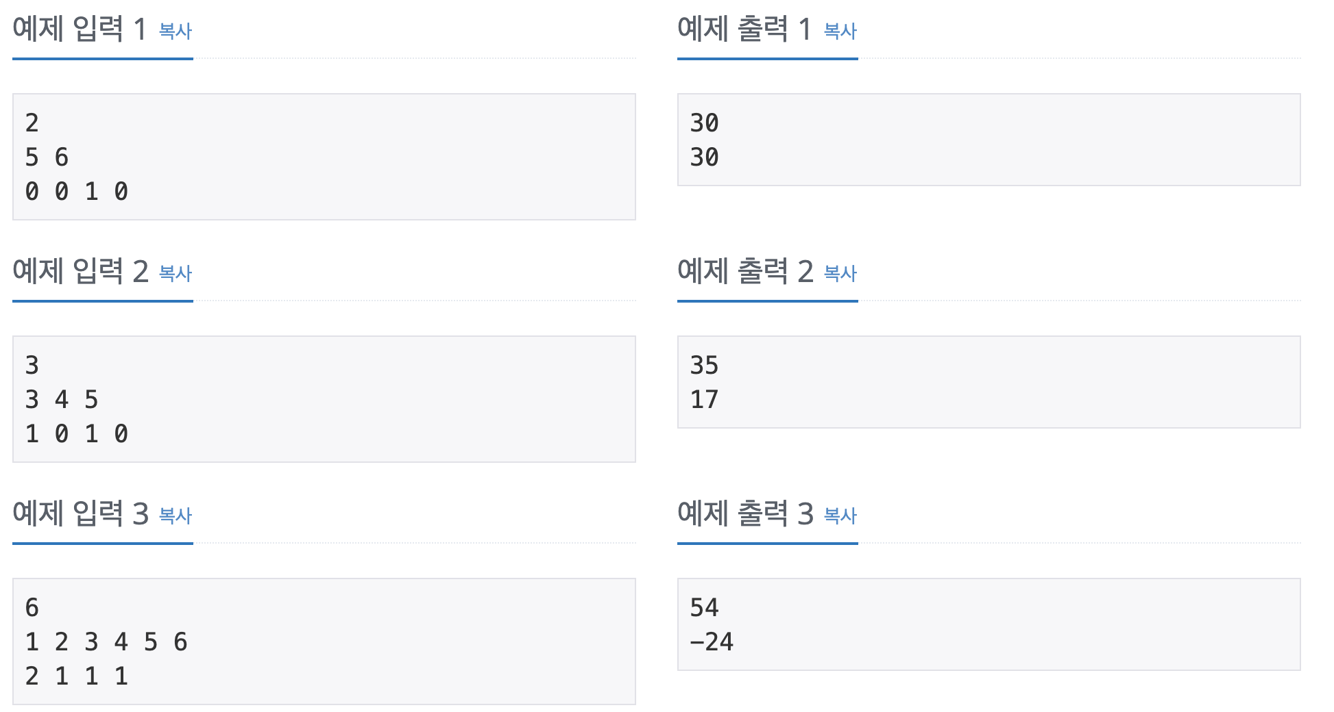 ์ฒซ์งธ ์ค์ ์์ ๊ฐ์ N(2 ≤ N ≤ 11)๊ฐ ์ฃผ์ด์ง๋ค. ๋์งธ ์ค์๋ A1, A2, ..., AN์ด ์ฃผ์ด์ง๋ค. (1 ≤ Ai ≤ 100) ์ ์งธ ์ค์๋ ํฉ์ด N-1์ธ 4๊ฐ์ ์ ์๊ฐ ์ฃผ์ด์ง๋๋ฐ, ์ฐจ๋ก๋๋ก ๋ง์ (+)์ ๊ฐ์, ๋บ์ (-)์ ๊ฐ์,